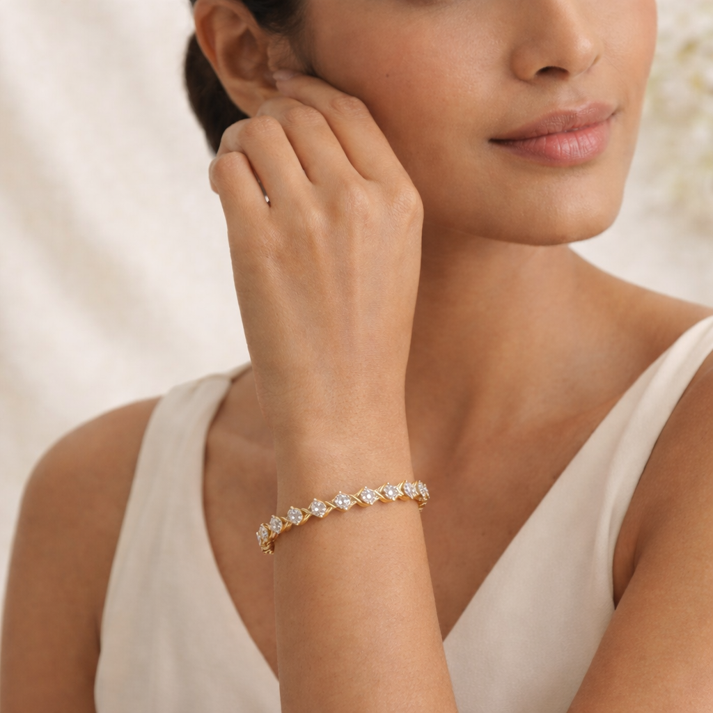 The American Diamond Bangle pairs effortlessly with a wide range of Indian outfits. It complements bridal sarees, lehengas, anarkalis, and contemporary ethnic wear with equal grace. The dual-tone finish blends well with gold, ivory, champagne, beige, and pastel color palettes. Whether worn as a single statement piece or combined with other bangles, it enhances the overall look without overpowering the attire.