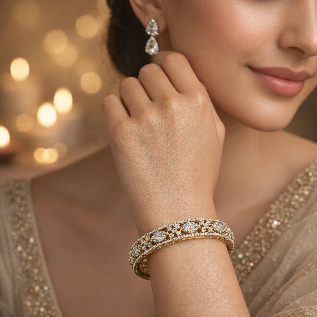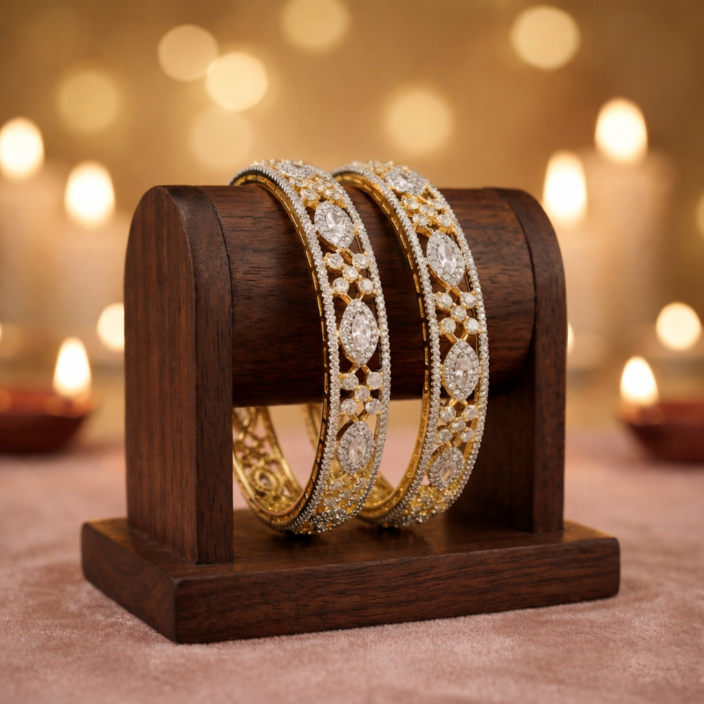 The American Diamond Bangle pairs effortlessly with a wide range of Indian outfits. It complements bridal sarees, lehengas, anarkalis, and contemporary ethnic wear with equal grace. The dual-tone finish blends well with gold, ivory, champagne, beige, and pastel color palettes. Whether worn as a single statement piece or combined with other bangles, it enhances the overall look without overpowering the attire.