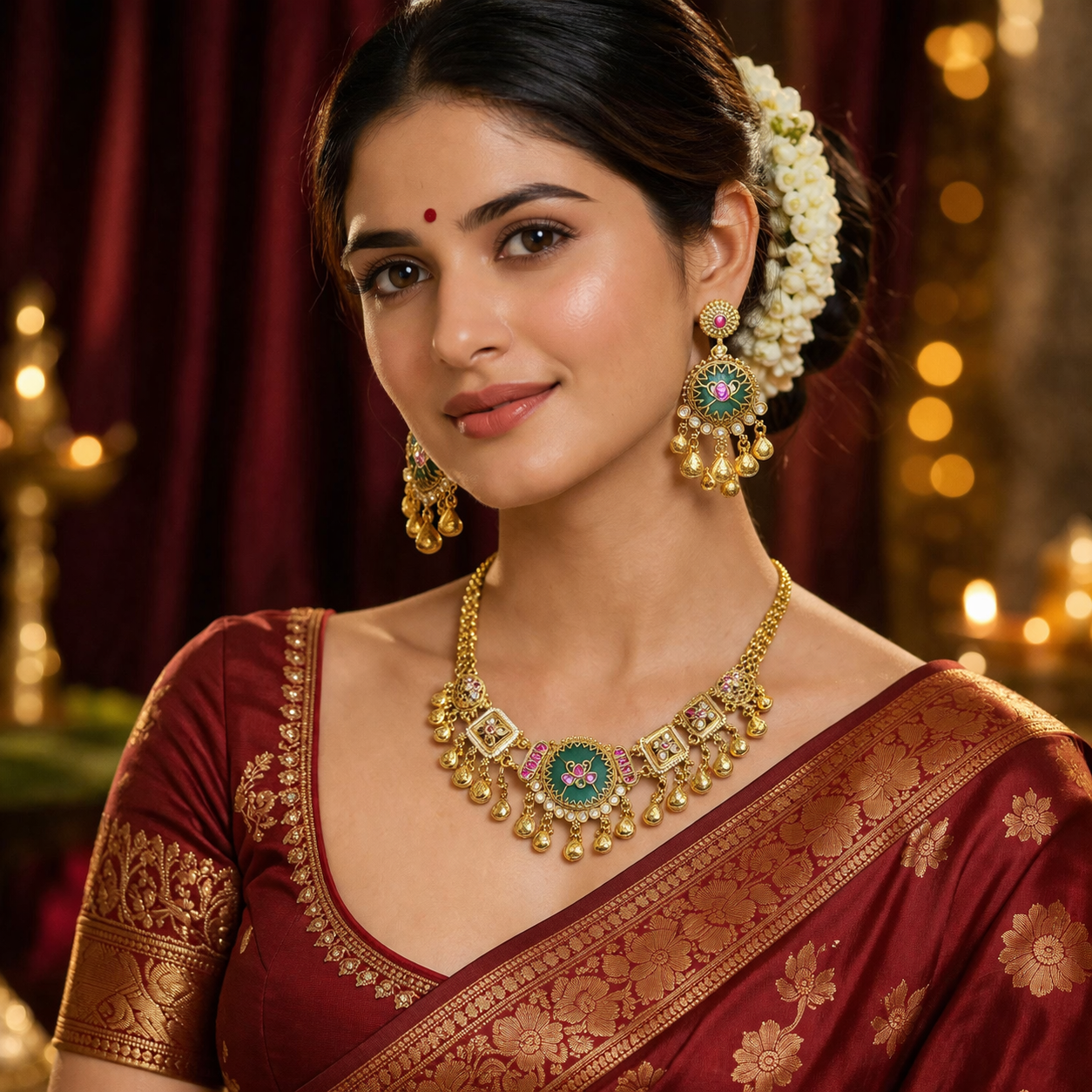 Inspired by classic Indian jewellery heritage, this Gold-Tone Choker Necklace Set blends floral artistry with balanced proportions. The design is rooted in traditional aesthetics yet refined to suit contemporary tastes. The gold-tone finish gives the set a rich, heirloom-like appearance, making it suitable for weddings, religious ceremonies, and festive occasions. Rama Creations focuses on designs that never go out of style, ensuring long-term value for your jewellery collection.