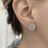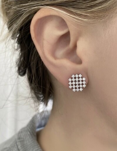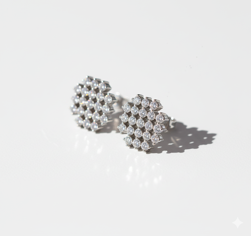 These earrings feature a compact geometric floral pattern that creates a refined and symmetrical visual appeal. Each earring is composed of multiple small clear stones arranged in a precise, repeating structure, forming a balanced and well-defined shape. The design appears evenly proportioned, giving the earrings a neat and polished look when worn. The clustered layout adds visual depth while maintaining a clean and minimal aesthetic. These earrings are designed to feel elegant rather than bold, making them suitable for those who prefer subtle sparkle with a structured form. The uniform pattern gives the earrings a timeless appearance that does not rely on trends.
